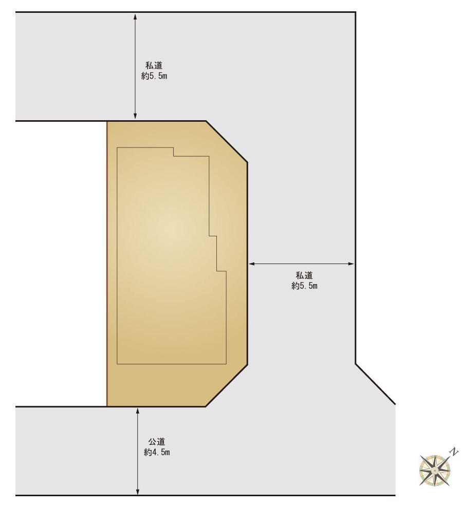 | 接道 | 北西 5.5m(幅員) 私道 北東 5.5m(幅員) 私道 南東 4.5m(幅員) 公道  |